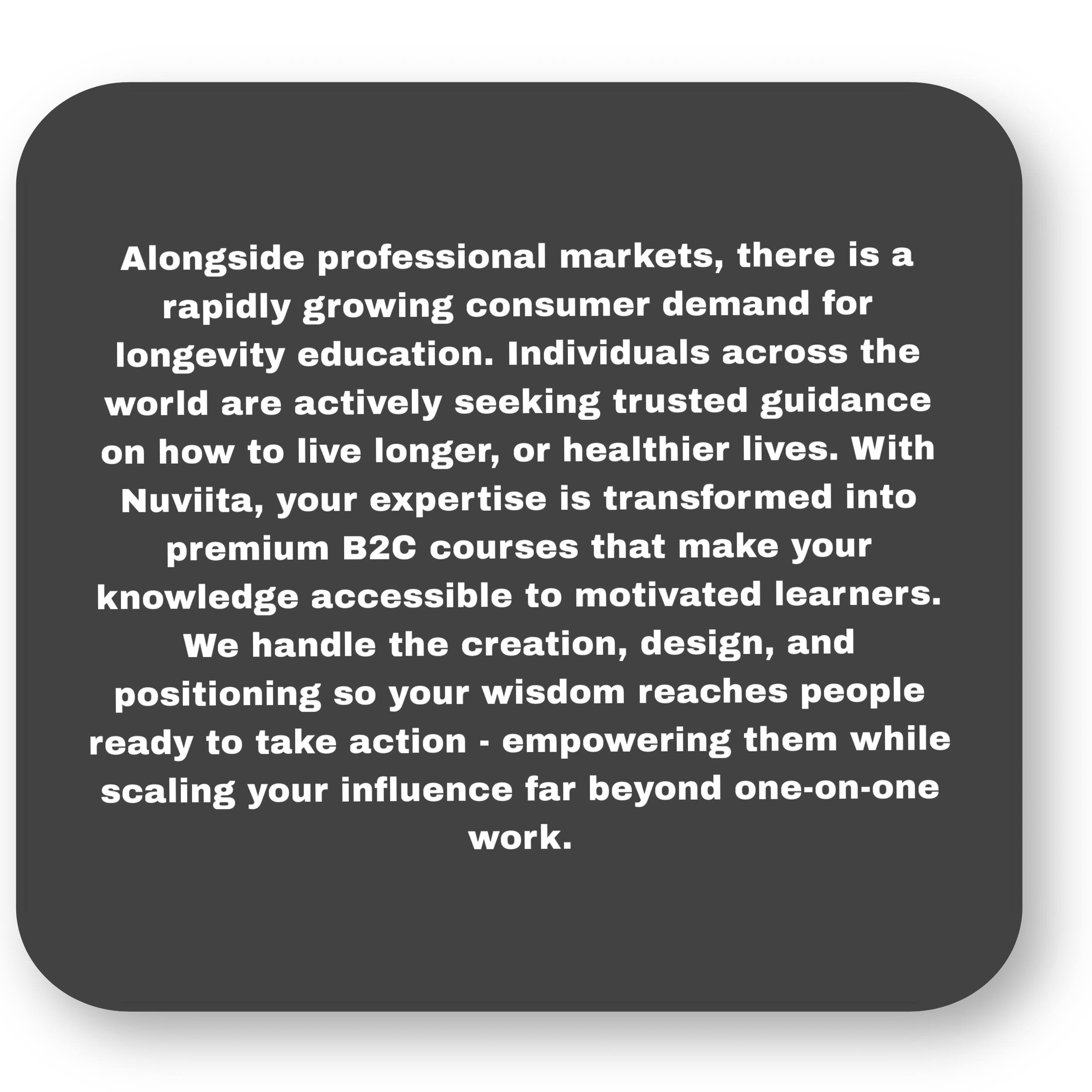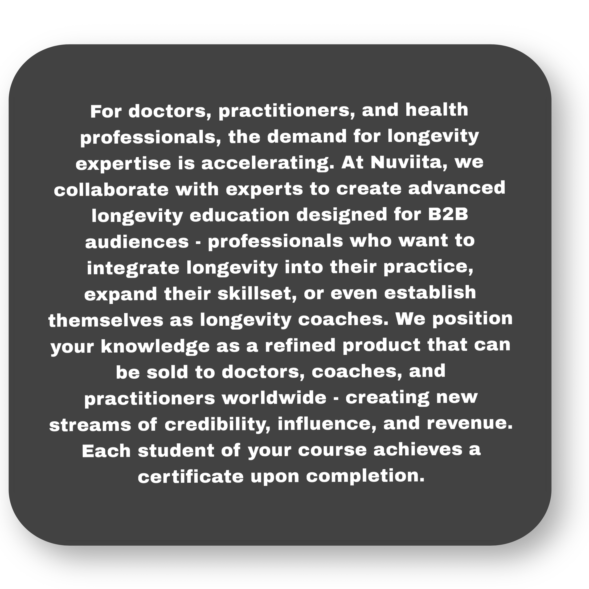 You may feel called to share your longevity expertise on a bigger scale - but the path isn’t always clear. That’s where Nuviita comes in. We help you shape your vision, design your course, and guide you through launch, marketing, and scaling. With a clear timeline and realistic revenue goals, we bring clarity and structure so you can grow your impact. Book a call with our founders to explore the next steps.